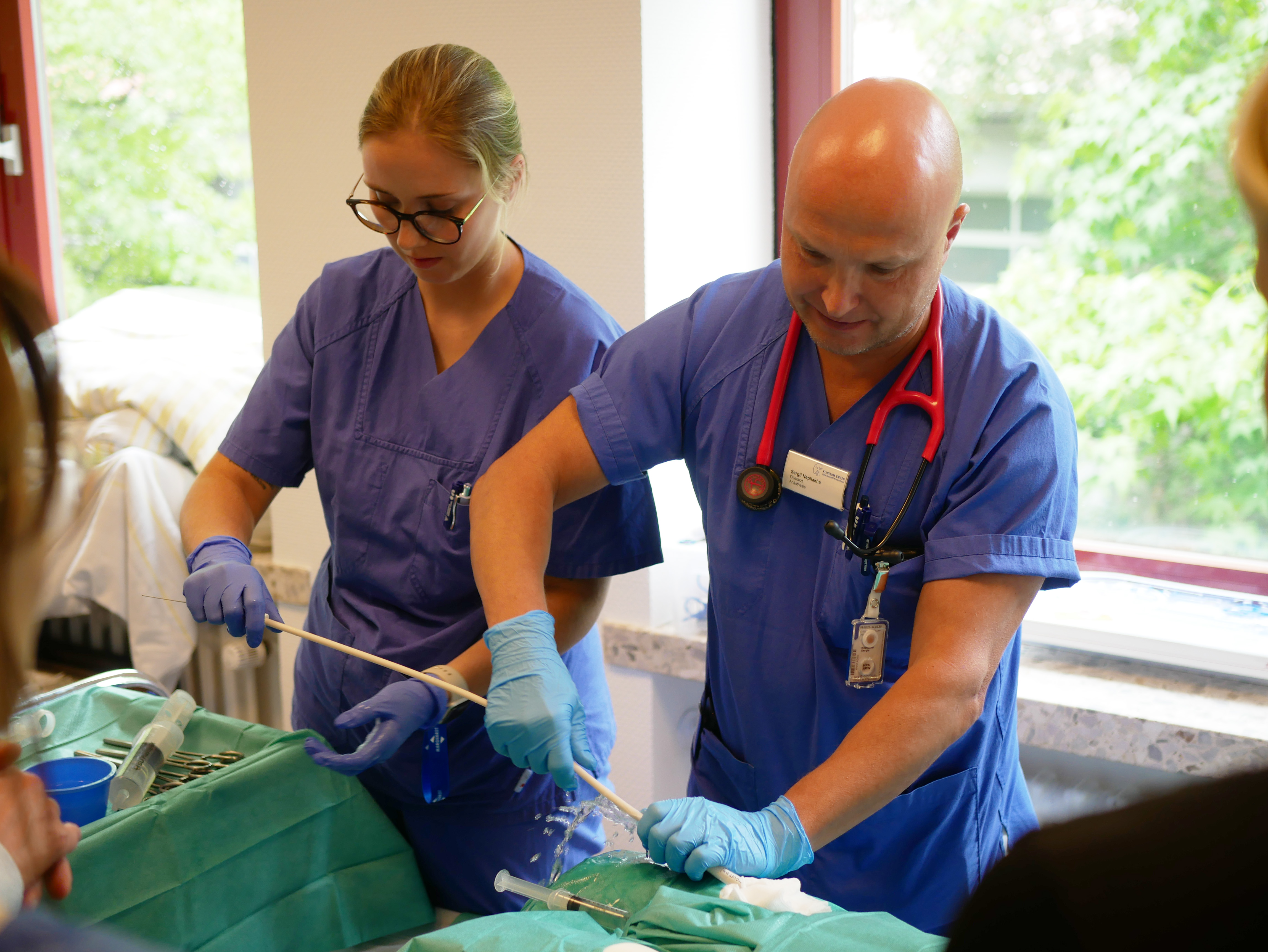 Im theoretischen Teil der Übung wurden deshalb sowohl die Grundlagen der extrakorporalen Membranoxygenierung vermittelt als auch ein Bezug zu technischen Abläufen und Sicherheitsaspekten herausgearbeitet. Ein Schwerpunkt lag darüber hinaus auf den praktischen Übungen am Kanülierungstrainer, einem speziellen Übungsmodell zur realistischen Simulation des Einführens von Kanülen in Blutgefäße. Zudem trainierten die Teilnehmenden den Umgang mit dem ECMO-System und wurden in Troubleshooting-Szenarien, in denen typische Fehler oder Störungen simuliert werden, auf mögliche Komplikationen und Notfallsituationen vorbereitet.