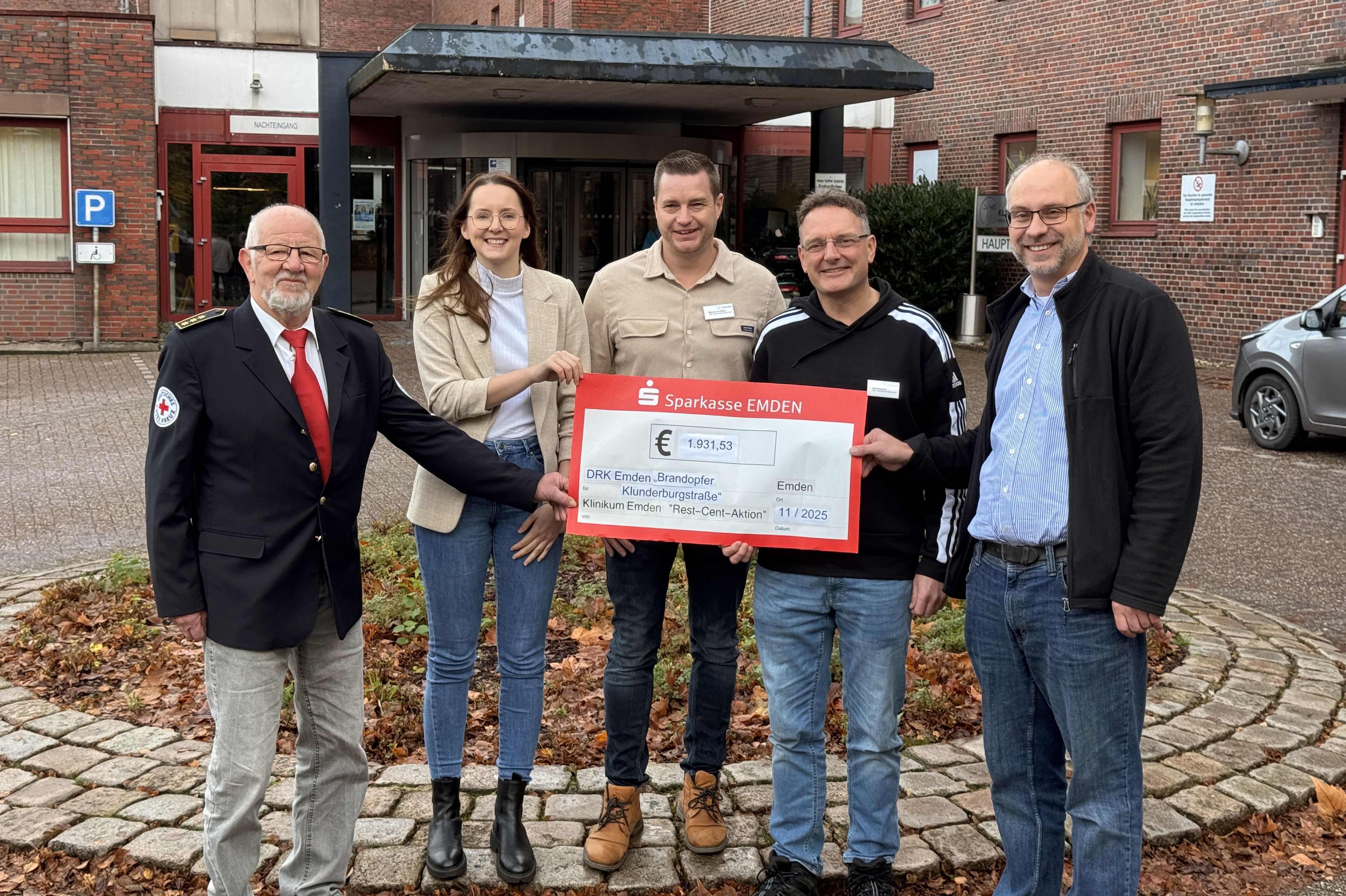 Emden. Im August kam es in einem Emder Mehrfamilienhaus in der Klunderburgstraße zu einem schlimmen Brand, der das Zuhause von zahlreichen Menschen zerstörte. Um den Betroffenen weitere Unterstützung zu geben, spendeten die Mitarbeiter des Klinikums Emden, der ANE-Service GmbH sowie der Trägergesellschaft und des MVZ Emden insgesamt 1931,53 Euro an das Deutsche Rote Kreuz Emden. Das Geld stammt aus Restcent-Beträgen ihrer monatlichen Gehaltsabrechnungen. „Unsere jährliche Restcent-Spende kommt immer einem sozialen Projekt zugute. Wir wollen als großes Unternehmen der Region etwas zurückgeben. Diese Aktion passt sehr gut zum sozialen Zusammenhalt und wir wollen diesen Gedanken mittragen“, erklärten Daniel Rosema, Manuel von Holten und Jens Korporal aus dem Vorstand des Betriebsrates des Klinikums Emden.